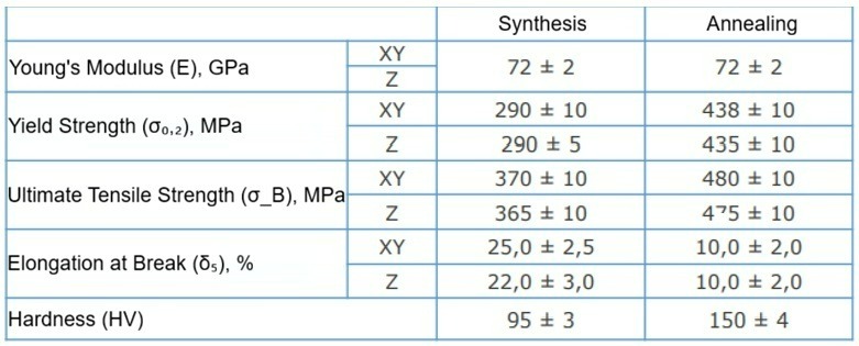 · Annealed: 480 MPa (XY), 475 MPa (Z).